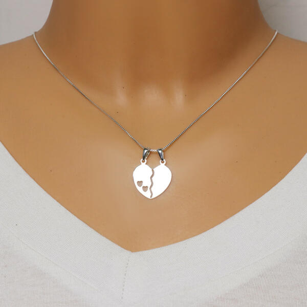 925 Ezüst kettős medál hasított szív alakú, egyik oldalán két kis szív kivágásával. A szív lapos és tükörsimára csiszolt, középen repedést ábrázoló vágás fut végig, amely a szívet kettévágja. A kettős medál mindkét részéhez egy lánckapocs van rögzítve. Dupla medál mérete: 21 x 20 mmA kapocs szélessége: 3 mmMedál tömege: 2,6 gFémjel - van.