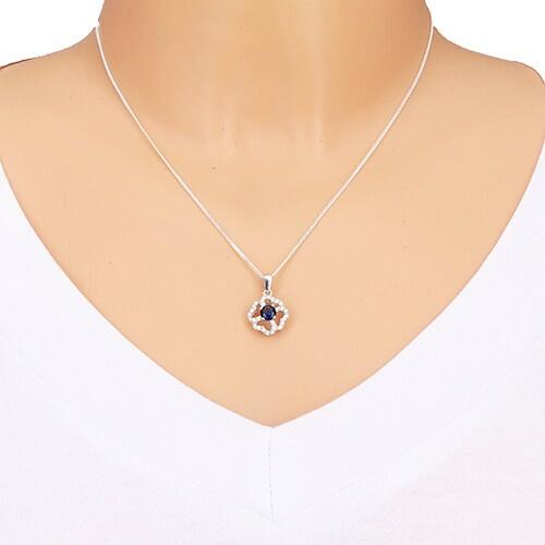 925 ezüst medál csillogó virág alakban, amely körvonala átlátszó cirkóniákkal van kirakva. A közepén egy sötétkék cirkónia helyezkedik el. A medál rész a láncra kerülő szem. Medál mérete: 13 x 13 mmA láncra kerülő szem szélessége: 4 mmSúly: 1,6 gFémjelzéssel ellátott. Medál lánc nélkül. A ródiummal kezelt felület biztosítja az ékszer tartósságát, nagyobb