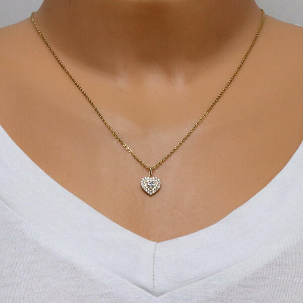 A medál 9K aranyból készült és szív alakú. A szívet csillogó átlátszó cirkóniák sűrűn díszítik. A közepében, két pálca között, egy kisebb cirkónia szív található. A láncra kerülő szem ovális alakú, felfelé szélesedik. A medál mérete: 10 x 11 mmA láncra kerülő szem szélessége: 1,5 mmA medál súlya: 0,68 gFémjelzéssel ellátva. Medál lánc nélkül.
