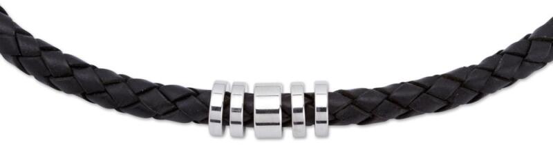 Rozsdamentes acél és bőr férfi nyaklánc. Fekete színű természetes bőr. Biztonsági zár. Többféle méretben. Cikkszám : K49BL Szín : Fekete Nyaklánc anyaga : Rozsdamentes acél és bőr Méretválaszték (hossza) : 45 , 50 cm Bőr vastagsága : 6mm Nikkelmentes : Igen Vízállóság : nem vízálló Garancia : A termékre egy év garancia érvényes!