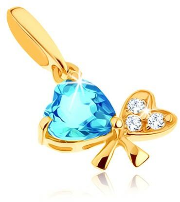 Medál 14K sárga aranyból masni alakban, mely egyik része három kerek átlátszó cirkóniával van kirakva, a másikat szív alakra csiszolt kék topáz cirkónia díszít. A függő szalagok fényesek és simák. A láncra kerülő szem hosszúkás. A medál méretei: 10 x 7 mm A medál súlya: 0,4 gA láncra kerülő szem szélessége: 1,5 mmFémjelzéssel ellátott. Medál lánc nélkül.