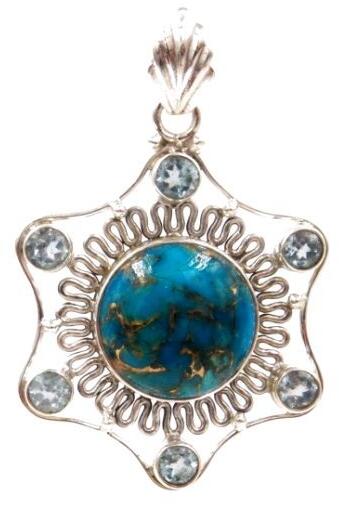 Természetes türkiz drágakőből készült virág medál, kék topáz kövecskékkel díszítve. A türkiz mérete: 15mm a medál mérete: 30mm teljes magasság: 45mm Bővebb információ "ADATOK PARAMÉTEREK" fül alatt. Az türkiz gyógyhatása