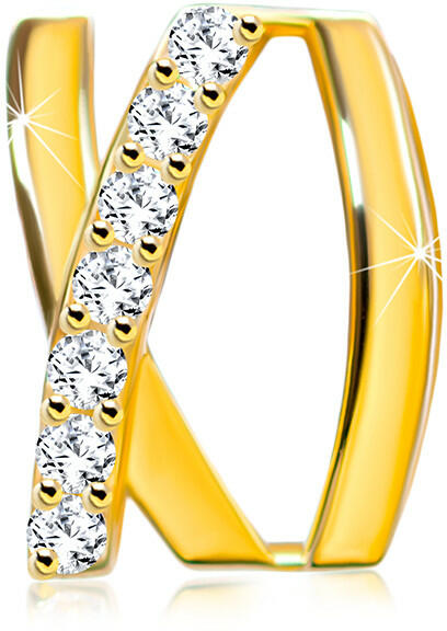 A 14K sárga arany medál egy háromszorosan tekert, vékony szalagot formál, amely egy üreges hengert alkot egymást keresztező csíkokkal az elülső részben. Két csík felülete sima és fényes, a harmadik csíkot pedig beültetett, kerek, átlátszó cirkóniák allkotják. A láncra kerülő szemet a medál közepén elhelyezkett üreges rész alkotja. Medál méretei: 5 x 7 mmMedál s