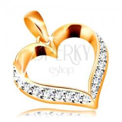 Az 585 arany medált egy szimmetrikus szív körvonal alkotja, amelynek a vonalai enyhén csavartak. A medál alsó részét fehér arany réteg és beültetett, átlátszó cirkóniák díszítik. A medál felső rész fényes és sima. A láncra kerülő szem hosszúkás alakú és felfelé haladva enyhén szélesedik. Medál átmérője: 14 x 14 mmMedál súlya: 0,7 gLáncra kerülő szem szél