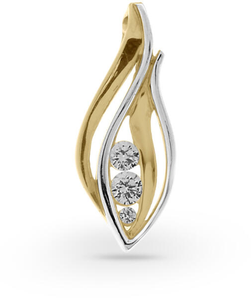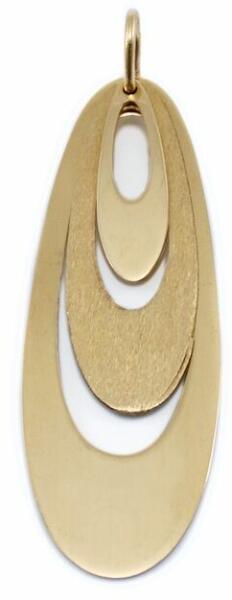 Modern stílusú, könnyű súlya ellenére mutatós darab ez a három részből álló, mattítással díszített, áttört, hosszúkás arany medál.