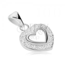 925 ezüst medál átlátszó cirkóniás szív kontúr alakban. A belső keret sima és fényes. A láncra kerülő szem hosszúkás és felfelé szélesedik. A medál méretei: 12 x 20 mmA medál súlya: 1,0 gA láncra kerülő szem szélessége: 3 mmFémjelzéssel ellátott. Medál lánc nélkül.
