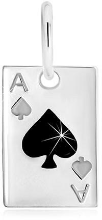 925 ezüst medál, kártyalap motívum. A medál első oldalán ász szimbólum található amely fekete fénymázzal van kitöltve. A medál hátsó része sima, fényes. A láncra kerülő szem ovális. Medál méretei: 7 x 11 mmLáncra kerülő szem szélessége: 2,5 mmMedál súlya: 0,49 gFémjelzéssel ellátott. Medál lánc nélkül.