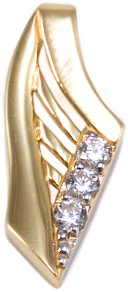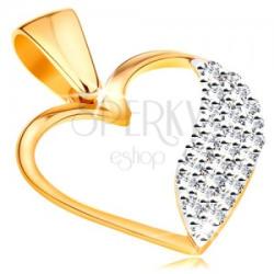 A kombinált 14K aranyból készült medál egy fényes, szimmetrikus szív körvonalból áll, sima felülettel. Az egyik oldalon a szív vonala egy széles, fehér aranyból készült hullámban folytatódik, amely a végein szűkül. Beültetett, átlátszó, kerek alakú cirkóniák díszítik. A láncra kerülő szemnek hosszúkás és szélesített alakja van. Medál méretei: 15 x 16 mmMed