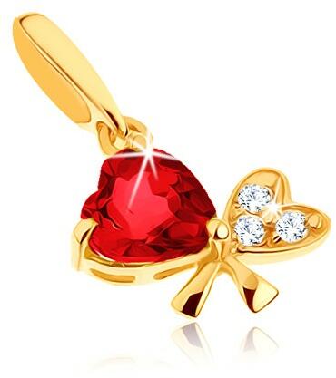 Medál 9K sárga aranyból masni alakban, mely egyik része három kerek átlátszó cirkóniával van kirakva, a másikat szív alakra csiszolt piros gránt díszít. A függő szalagok fényesek és simák. A láncra kerülő szem hosszúkás. A medál méretei: 10 x 7 mm A medál súlya: 0,3 gA láncra kerülő szem szélessége: 1,5 mmFémjelzéssel ellátott. Medál lánc nélkül.