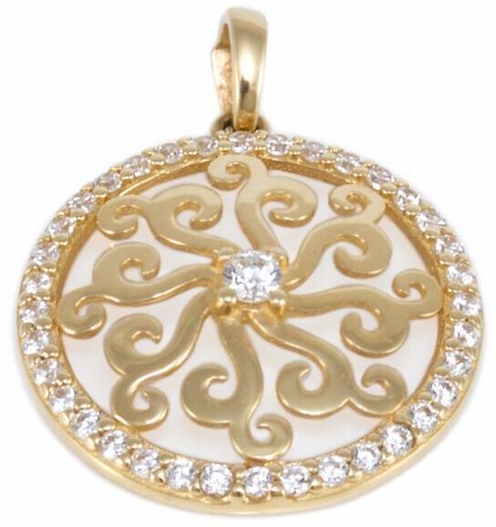 Modern stílusú, kör alakú, csillogó cirkónia kövekkel díszített keretben áttört virág motívummal ékített arany medál.