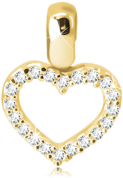 Medál sárga aranyból, szív enyhén hosszított alsó résszel. A medál enyhe szívkörvonalból áll, melyben csillogó cirkóniák vannak beültetve. A medál széle kitöltött, a felszíne recés. A medál méretei:9 x 11 mmA medál súlya: 0,7 gA láncra kerülő szem mérete: 2 mmFémjelzéssel ellátott. Az ár egy medálra vonatkozik, lánc nélkül.