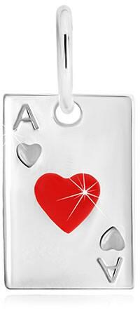 925 ezüst medál kártyalap motívummal. A kártya első oldalán ász motívum található szívvel amely piros fénymázzal van kitöltve. A medál hátsó része sima, fényes. A láncra kerülő szem ovális. Medál méretei: 7 x 11 mmLáncra kerülő szem szélessége: 2,5 mmMedál súlya: 0,53 gFémjelzéssel ellátott. Medál lánc nélkül.
