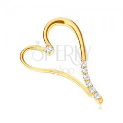 Arany medál hosszított szív alakban. A körvonala vékony, szabálytalan. Az alsó részében egy sor csillogó cirkónia van kirakva, a felső csúcsán egy kisebb. A láncon lévő szem a jobb hátsó oldalán van elrejtve, ami azt jelenti hogy a medál görbén lesz a láncon. Méretek: 15 x 26 mmA medál súlya: 1 gA láncon lévő szem szélessége: 1 mmMedál lánc nélkül. Fémjelzésse