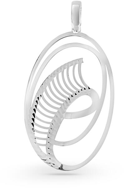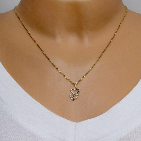 A 9K kombinált aranyból készült medál két egymásra helyezett, szabálytalan szívet ábrázol, amelyeket egy középen futó összekötő vonal kapcsol egymáshoz. A kontúrt csillogó körök díszítik, amelyeket csiszolt háromszögek alkotnak. A medál felülete sima és fényes. A láncra kerülő szem ovális alakú, felfelé szélesedik. A medál mérete: 9 x 15 mmA láncra kerülő
