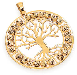 Modern női medál Életfa sárga aranyból. Kerek peremét a kerület mentén gravírozott golyók díszítik.