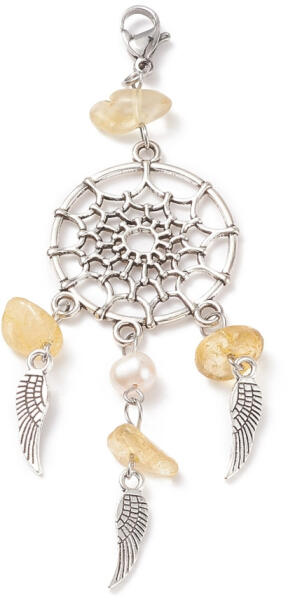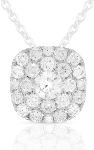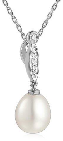 Fehérarany medál gyémántokkal és édesvízi Biwa gyönggyel, fehér színű. A medál szemét öt briliáns csiszolású gyémánt díszíti, amelyek összsúlya 0,020 ct, színük H, tisztaságuk SI1. A gyöngy ovális, könnycsepp alakú, 7,5 x 9 mm-es. A medál magassága 20 mm. A medál fülének átmérője 2 mm, így a medál keskeny kapoccsal ellátott láncra alkalmas.
