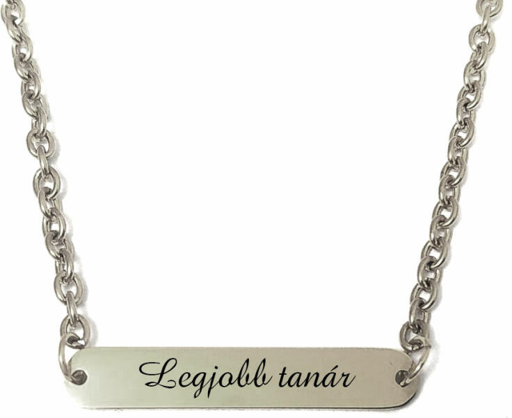 Paraméterek: – Nyaklánc: A szemek kb. 3x4 mm-esek, nem nagyon vastag, nem is vékony. Anyaga rozsdamentes acél. A felirat lapocska kb. 30x6 mm-es, rozsdamentes tüköracél. A lánc hossza és színe választható a listából. Ha nem választasz méretet, alapesetben 50 cm hosszú, és a főképen látható színű láncot küldjük. Tisztítani csak langyos vízzel ajánlott. Vegyszer haszn