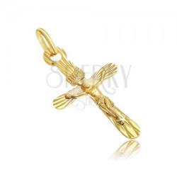 Medál sárga aranyból nagyobb kereszt alakban ovális befejezéssel és szélesedő szárakkal. A felszíne bevágott kis háromszög alakú táblákkal díszített, melyek folyamatos összekapcsolása fényes sugarakat alkot. A közepén Krisztus alakja van megfogva INRI táblával a feje felett. A medál méretei: 15 x 28 mmA medál súlya: 0,8 gA láncon lévő szem szélessége: 3 mmFémjelz