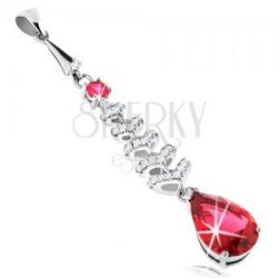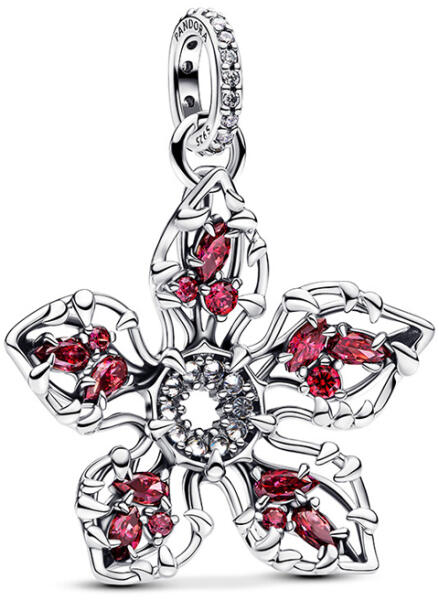 Fénylő 925 ezüst medál, amelyet egy függőleges sáv alkot apró cirkóniákkal kirakva, amely egy piros, kerek cirkóniával végződik. A fokozatosan szélesedő nyilacskák alatt, amelyek átlátszó cirkóniákkal van díszítve egy könnycsepp alakú cirkónia függ. A medál része a láncra kerülő szem. Méret (kapoccsal együtt): 8 x 49 mmA láncra kerülő szem szélessége: 3 mmS
