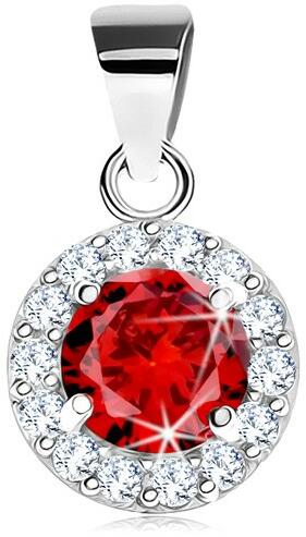 925 ezüst medál piros csiszolt kerek cirkóniával és átlátszó csillogó cirkóniás szegéllyel. A medál része a sima fényes láncra kerülő szem is. Medál átmérője: 11 mmMedál súlya: 1,7 gA láncra kerülő szem szélessége: 3 mmFémjelzéssel ellátott. Medál lánc nélkül.