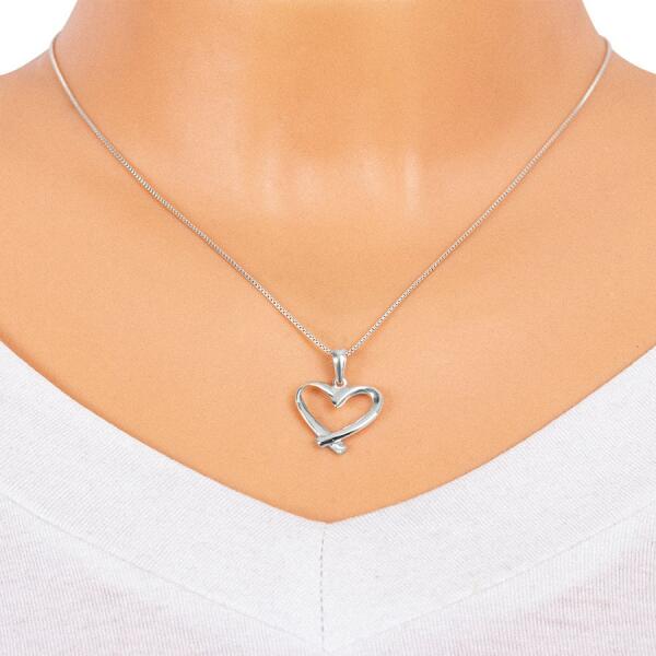Fényes 925-ös ezüst medál szív alakban. A szív körvonala egy szalag formára hasonlít, melynek az alsó részén a két szabad vég csak egymásra van helyezve, keresztben. A medál méretei: 17 x 15 mmA láncra kerülő szem nagysága: 4 mmAz ár egy medálra vonatkozik, lánc nélkül. A medál súlya: 1,6 gFémjelzéssel ellátott.