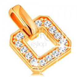 14K sárga arany medál, négyzet körvonal amelyet cirkóniák díszítenek átlátszó változatban. A négyzet szélei lekerekítettek. A láncra kerülő szem fényes és sima. Medál mérete: 6 x 6 mmSúly: 0,4 gLáncra kerülő szem szélessége: 2 mmFémjelzéssel ellátott. Medál lánc nélkül.