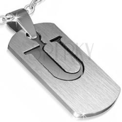 Acél medál, amely két részből áll. Az egyik rész egy matt ezüst színű tábla kivágott "U" betűvel, a másik rész egy fényes nyomtatott "U" betű. Mindkét rész egymásba illik, és együtt függnek a láncszemen. Méretek: 17 x 32 mmA láncon lévő szem szélessége: 4 mmMedál lánc nélkül.