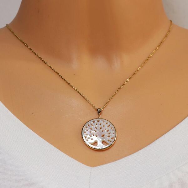 A 9K arany medál egy nagyobb vékony karika, amely sima és fényes felületű. A kör belsejében egy elágazó, szivárványos tükröződésű, gyöngyházból készült életfa található. A medálon a láncra kerülő láncszem a teteje felé kiszélesedik. Medál átmérője: 26 mm A láncra kerülő szem szélessége: 2,5 mm A medál súlya: 1,94 g Fémjel - van. A lánc nem tartozék.