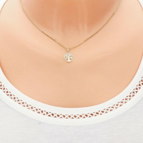 A sárga 14K arany medál kör alakú. A kör közepét egy terebélyes életfa tölti ki, precízen kivágott koronával, lekerekített levelekkel. A láncra kerülő szem ovális alakú. Medál átmérője: 11 mmMedál súlya: 0,24 gLáncra kerülő szem szélessége: 2 mmFémjelzéssel ellátott. Medál lánc nélkül.