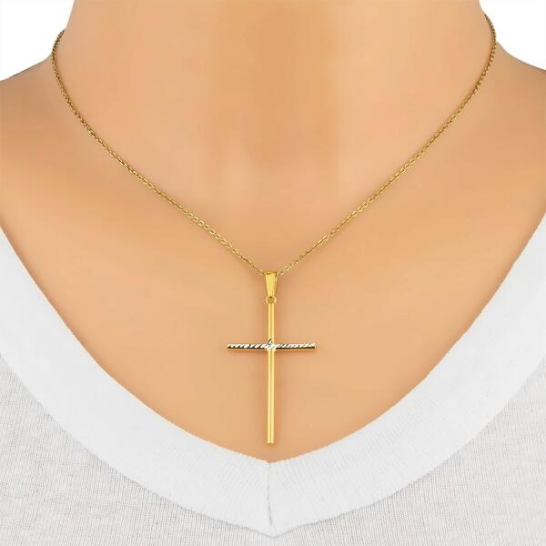 925 ezüst medál latin kereszt formában, vékony fényes vállakkal, arany színben. A rövid vízszintes vállakat átlós ezüst színű csíkok díszítik. A láncra kerülő láncszem hosszúkás és felfelé kiszélesedik. A medál méretei: 23 x 42 mm A láncra kerülő láncszem szélessége: 3 mmA medál súlya: 1,7 gFémjel - Van. A lánc nem tartozék.