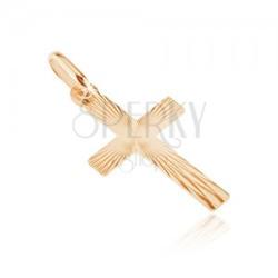 Medál 14K aranyból lapos latin kereszt alakban. A felszínét lemetszett kis keskeny háromszögek díszítik, melyek folyamatos összekapcsolásával fényes sugarakat alkotnak. Méretek: 13 x 23 mmA medál súlya: 0,4 gA láncon lévő szem szélessége: 3 mmMedál lánc nélkül. Fémjelzéssel ellátott.