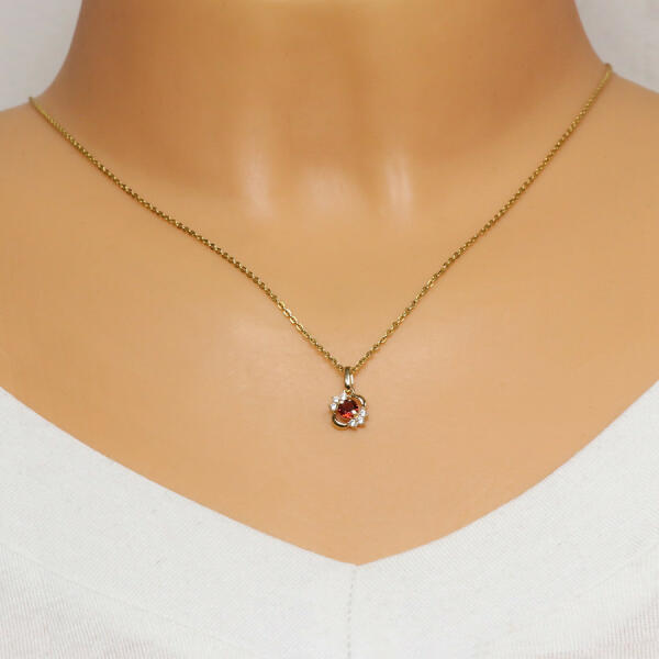 Medál 14K sárga aranyból, finoman kidomborodó elipszis kontúrral, fényes, sima felülettel, miközben a felső és alsó szár három, átlátszó cirkóniával van díszítve. Az elipszis közepén egy csiszolt, kerek, piros gránát helyezkedik el, két karommal odaerősítve. A láncra kerülő szem hosszúkás, fényes és sima. A medál méretei: 8 x 8 mmA medál súlya: 0,5 gA láncra