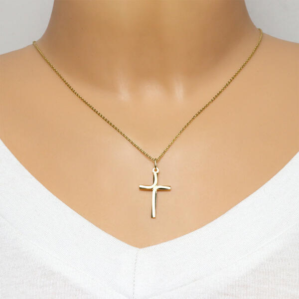 Medál aranyból, kereszt sima szárral. A felszíne matt hosszított ívvel díszített mely a kereszt teljes vonalán húzódik. A hajlatokban egy lemetszett vonal található fényes felszínnel. A kereszt közepén az ívek párhuzamosan futnak. A medál méretei: 16 x 29 mmA medál súlya: 1,3 gA láncon lévő szem szélessége: 3 mmFémjelzéssel ellátott. Medál lánc nélkül.