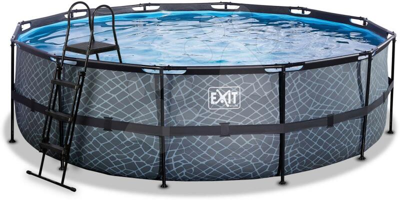 Medence vízforgatóval Stone pool a holland Exit Toys műhelyéből a legnagyobb medence 488*122 cm méretekkel, így az egész családnak kellemes fürdőzést biztosít a forró nyári napokon. Szürke színű robosztus medence oldalfala kőmintával minden udvart és kertet még szebbé varázsol, erős acél medencekeret portechnológiával kezelve ellenáll a korróziónak és a kedvezőtlen