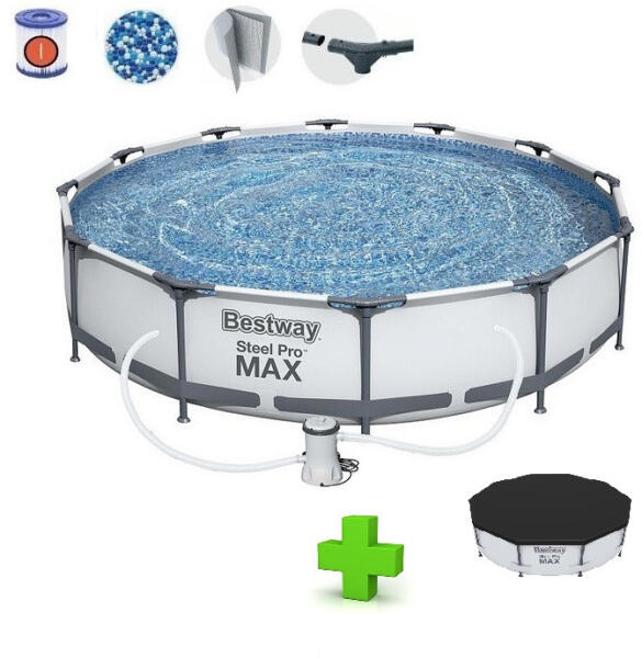 A Bestway Steel Pro MAX medenceszett rendkívül kényelmes megoldást jelent azok számára, akik nyáron kertjükben szeretnének úszni. A kör alakú medence acélból és Tritech anyagból készült, mely bizonyítottan ellenáll az UV-sugárzásnak és a klórnak. ?rtartalma 4678 L (90%-os telítettségnél). A kiváló min?ség? acélváz er?s, tartós és rozsdaálló. A medenceszett egy m