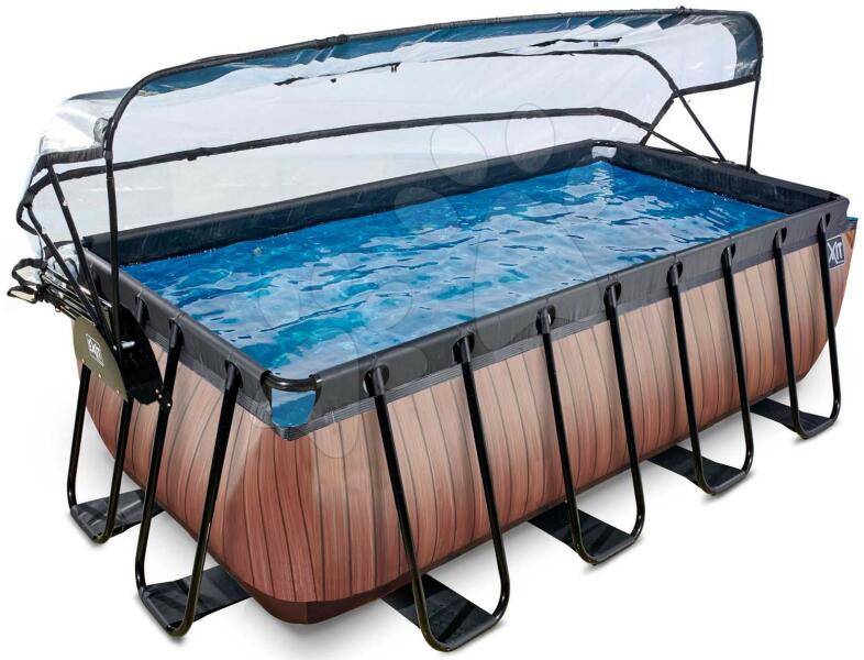 Medence szűrős szivattyúval Wood pool a holland Exit Toys műhelyéből egy 400*200*122 cm méretekkel rendelkező tágas medence, mely szülőknek és gyerekeknek egyaránt kellemes felfrissülést nyújt majd a nyári hőségben. Barna robosztus medence oldalfala famintával minden udvart és kertet még szebbé varázsol, erős acél medencekeret portechnológiával kezelve ellenáll a korr