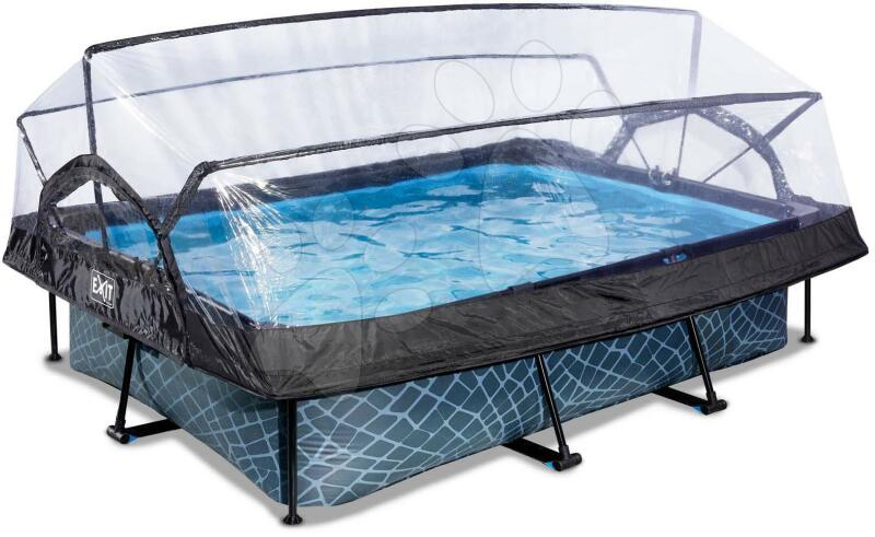 Medence búrával szűrős szivattyúval Stone pool a holland Exit Toys műhelyéből egy 300*200 cm méretekkel rendelkező föld feletti medence, mely szülőknek és gyerekeknek egyaránt kellemes felfrissülést nyújt majd a nyári hőségben. Szürke robosztus medence oldalfala kőmintával minden udvart és kertet még szebbé varázsol, erős acél medencekeret portechnológiával kezelve