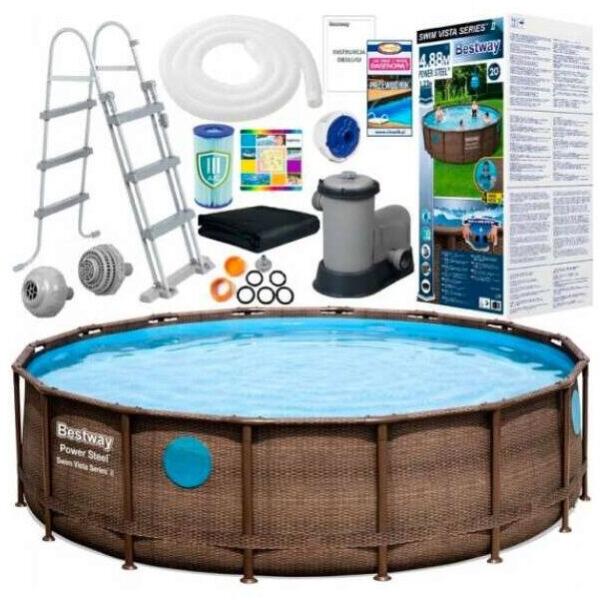 Power Steel Swim Vista kör alakú medence A medence mérete: 4.88m x 1.22m Vízbefogadó-képessége (90%)19480 liter - Könnyen felállitható - 3 rétegű erősített PVC rattan hatású medencetest - A beépitett áramlásszabályozóval ellátott leeresztőszelep megkönnyiti a leeresztést, ha a szelepet egy kerti tömlőhöz csatlakoztatja (mellékelt adapterrel) - A medence extra er