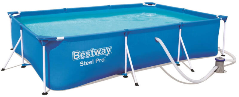 Bestway Steel Pro Fémvázas Négyszögletű Medence 300x201x66cm leírása -Típusát tekintve földfelszín feletti -Négyszögletű forma -Könnyen és gyorsan összeszerelhető. -Medence mérete: 300 x 201 x 66cm -Kapacitása 90%-os kitöltésnél 3300L -Az anyag ellenáll a időjárás viszontagságainak, könnyen tisztán tartható. -A leeresztő szelep megkönnyíti a víz kiürítését. -