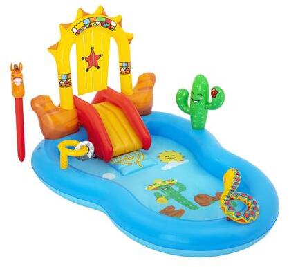 Nincs is jobb, mint pancsolással tölteni a forró nyári délutánokat a kertben. A Bestway Vadnyugat játszóközpont rengeteg vidám és izgalmas kaland ígéretével várja a piciket, a felhőtlen szórakozás garantált. Lehet csúszdázni, játszani az aranyos állatkákkal és a kaktusszal, pancsolni... A medence alján egy felfújható ülőpárna is található. A csúszda opcionálisan