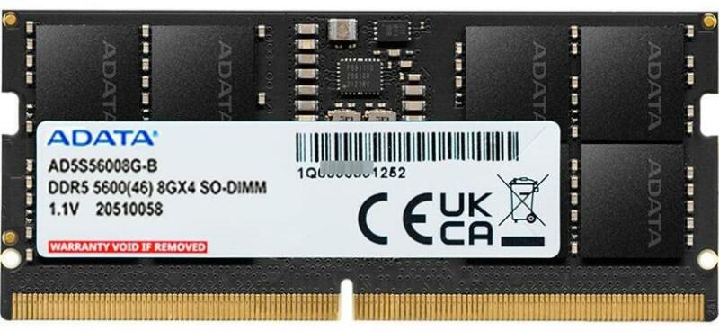 8 GB, 1 x 8 GB, DDR5, 5600 MHz, 262-pin SO-DIMM ADATA AD5S56008G-S. Járulékos komponens: Laptop, Belső memória: 8 GB, Memóriák elrendezése (modulok x méret): 1 x 8 GB, Belső memória típusa: DDR5, Memória órajel: 5600 MHz, Memória formatényező: 262-pin SO-DIMM, CAS látencia: 46