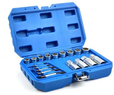Csavarkulcs és csavarkiszedő készlet sérült csavarokhoz, anyákhoz és törött csapokhoz. A 18 darabos készlet tartalmaz egy 3/8 méretű csavarkulcs készletet sérült/lekopott anyákhoz, egy csavarkiszedő készletet törött csavarokhoz, valamint egy 1/2 méretű csavarkulcs készletet törött csapokhoz. A termék jellemzői: Kiváló minőségű CrV acélból készült készlet Lehet
