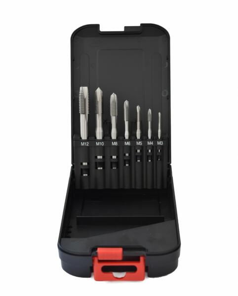 Abraboro 7 részes gépi menetfúró készlet, HSS-Co anyagminőség. Praktikus műanyag dobozban. A készlet mérete: 7db-os Anyagminőség: HSS-CO / DIN 371 B Élkialakítás: 4-5 terelőéllel átmenőfurathoz A készlet tartalma: 1-1 db M3/M4/M5/M6/M8/M10/M12