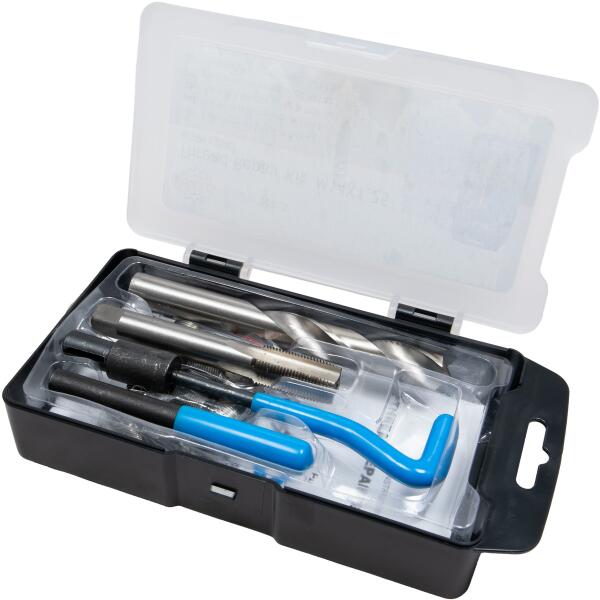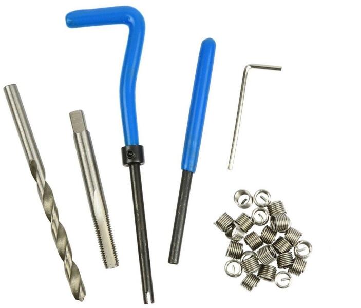 Leírás Menetjavító készlet sérült M6x1,0mm-es menetek javítására. A készlet tartalmaz egy kiváló minőségű HSS4341 gyorsacélból készült menetfúrót, egy fémcsiga fúrót, egy betétbehajtót és egy menetjavító betétkészletet. A termék jellemzői Fúró és menetfúró kiváló minőségű HSS4341 gyorsacélból M6-os menetek javítására tervezték Edzett rozsdamentes a
