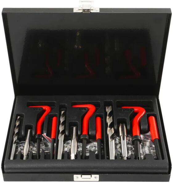 Kiváló minőségű menetjavító készlet. A fúrófejek és csapok HSS gyorsacélból készülnek. A készlet 3 féle szálhoz készült: M6 x 1,0 x 8,0 mm M8 x 1,25 x 10,8 mm M10 x 1,5 x 13,5 mm