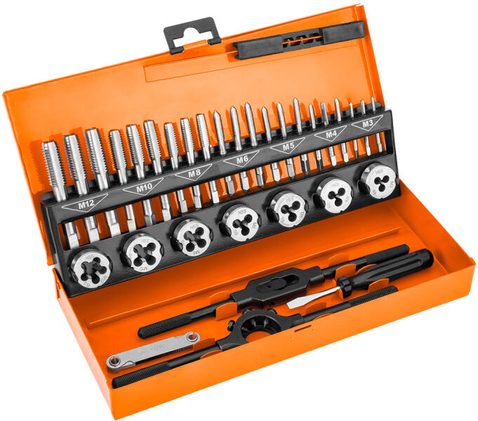 NEO menetszerszám készlet. 12-915 HSS acél készlet, amely kézi menetfúrókat, menetmetszőket, menetfésűt, csavarhúzót a szerszámok rögzítéséhez és egy praktikus fémkazettát tartalmaz az elemek tárolásához. A készlet a következő méreteket tartalmazza: M3, M4, M5, M6, M8, M10, M12 és vésők M3, M4, M5, M6, M8, M10, M12 . A NEO márka elemei nagyobb pontosságot biztosíta