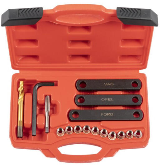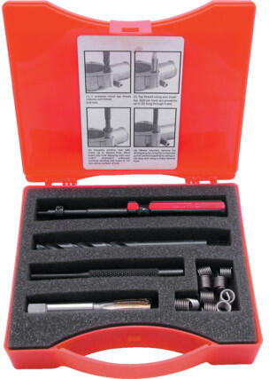 V-COIL Menetjavító műhely készlet M5-M12 Sérült vagy elhasználódott menetek javítására Huzalmenetes betétek DIN 8140, ISO 2 (6H) tűréshatár, S típus - rozsdamentes A készlet tartalma: 1-1 db HSS-G speciális méretű menetfúrót (M6 ; M8 ; M10) 1-1 db HSS magfúrót (6,3 ; 8,3 ; 10,4 mm) 1-1 db behajtó szerszámot (No. : 9 ; 11 ; 13) 1 db behajtófül eltávolítót (No. : 9 ; 1