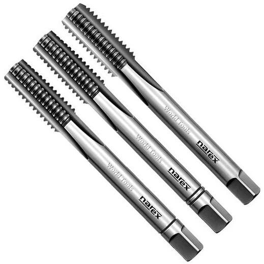 Narex Kézi menetfúró készlet, BALOS M8x1.25 menethez DIN352 szerint. Kivitel: 3 db-os készlet Alkalmazás: Általános feladatokhoz, a következő alapanyagokhoz: - Puha szerkezeti acélok 500 N/mm2-ig - Automata acélok, szerkezeti acélok és nemesített acélok 800 N/mm2-ig - Szürkeöntvény - Gömbgrafitos öntvény, temperöntvény - Vörösréz-ötvözetek (rövid forgács) - Alumíniu