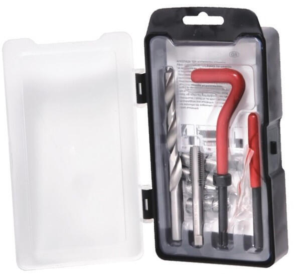 LEÍRÁS Készlet tartalma: Fúrószár Kiütő Menetfúró Behajtószár 10db menetjavító betét Feladata: A tönkrement menetet felújítsa. Használatával erős, strapabíró kötés hozható létre. Alkalmazható magasabb és alacsonyabb szilárdságú anyagokban egyaránt. Széles körben felhasználható. Ideális a motorokban lévő menetsérülések kijavítására. Erős kötést hoz l