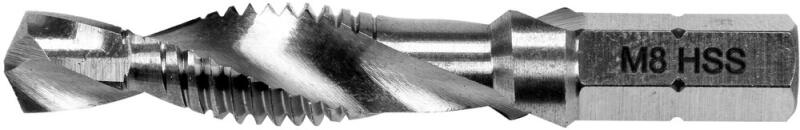 Kombinált gépi menetfúró HSS-M2 acélból Köszörült felület 1/4" hatszög szárral Méret: M8 Precíz metrikus menetek vágására tervezték. Gépi és kézi menetvágáshoz használható Kiváló minőségű HSS M2 gyorsacélból készült A köszörült felület kiváló pontosságot és gyorsabb fúrási sebességet biztosít Tartós és ellenáll a sérüléseknek Fúrók automatikus